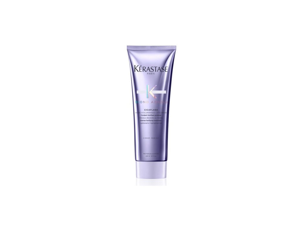 Kérastase Blond Absolu Cicaflash Treatment (250 ml) – Péče pro zesvětlené, odbarvené či melírované vlasy, která pracuje jako hybrid mezi maskou a kondicionérem. Jeho opalescentní, lehká gelová textura proniká do vlasového vlákna a dodává mu hloubkovou výživu, která poskytuje regeneraci již po krátké době působení ve sprše. Kombinace kyseliny hyaluronové a extraktu z protěže alpské pomáhá obnovit strukturu poškozených pramenů, zvyšuje jejich pevnost a chrání je před každodenním poškozením.