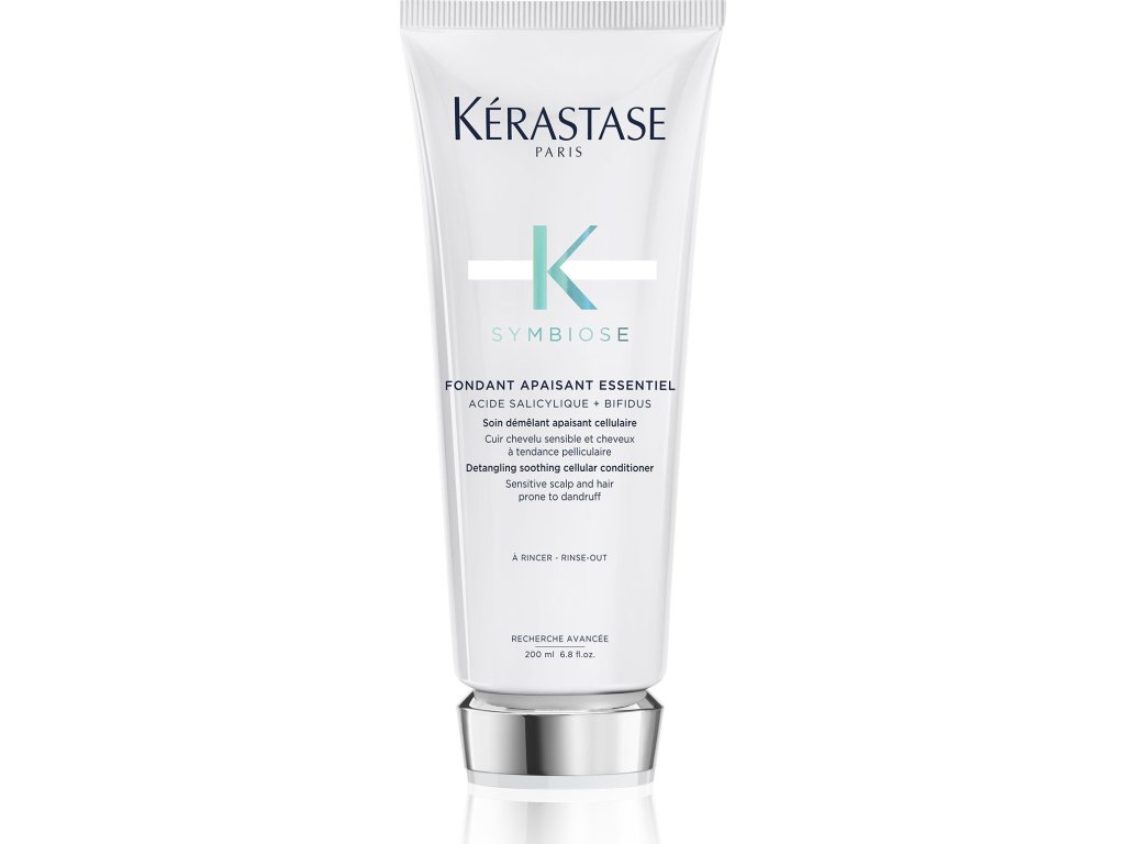 Kérastase Symbiose Fondant Apaisant Essentiel (200 ml) – Hydratační a zklidňující kondicionér s balzamovou texturou navržený speciálně pro citlivou pokožku hlavy, která je náchylná k podráždění a tvorbě lupů. Jeho lehká, výživná formule obsahuje kyselinu salicylovou, která pomáhá odstraňovat odumřelé buňky a lupy, a extrakt Bifidus, který podporuje zdravý mikrobiom pokožky hlavy.